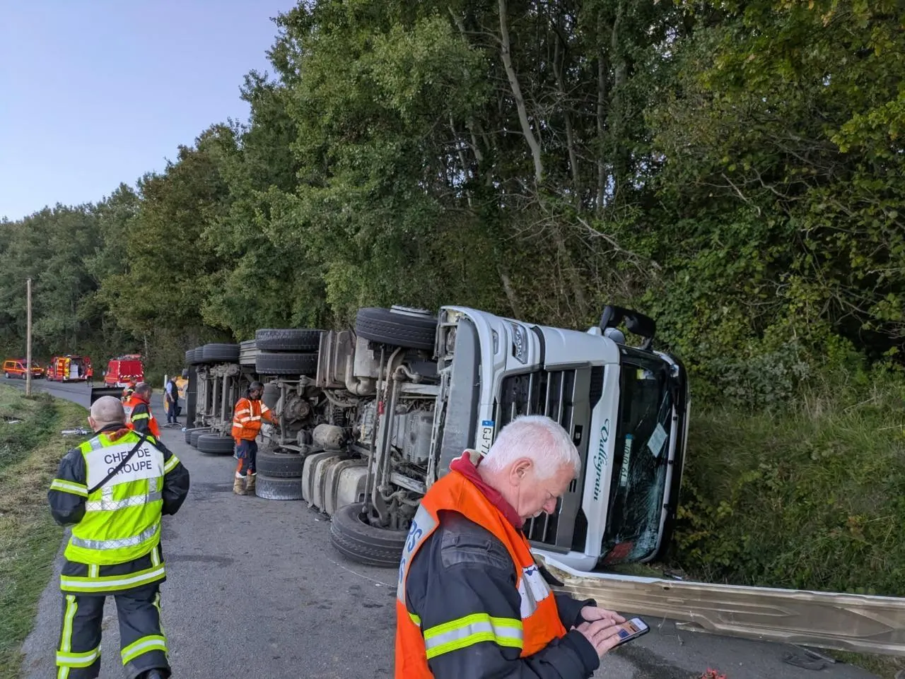 Un camion s’est couché sur le bord de la route départemental 55, juste avant l’entrée du bourg ...