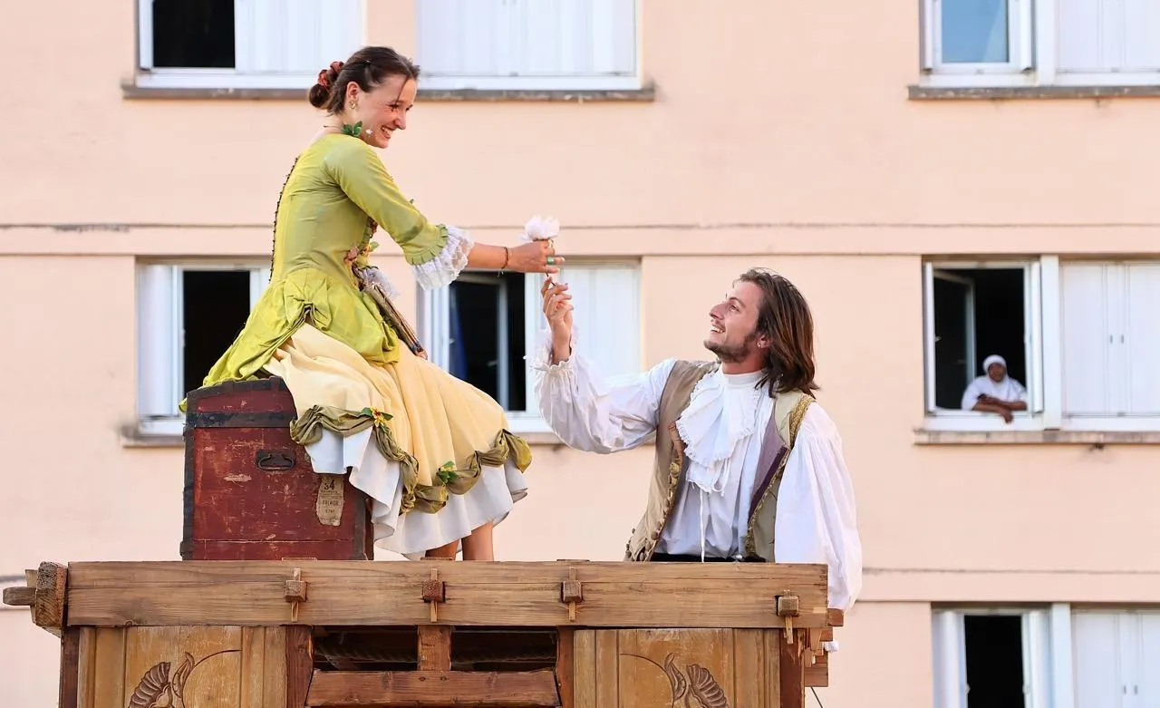 Une scène de la pièce « Le capitaine Fracasse » de La Houlala Compagnie, jouée sous les fenêtres du quartier prioritaire Saint-Exupéry, en août 2025. © Ouest-France