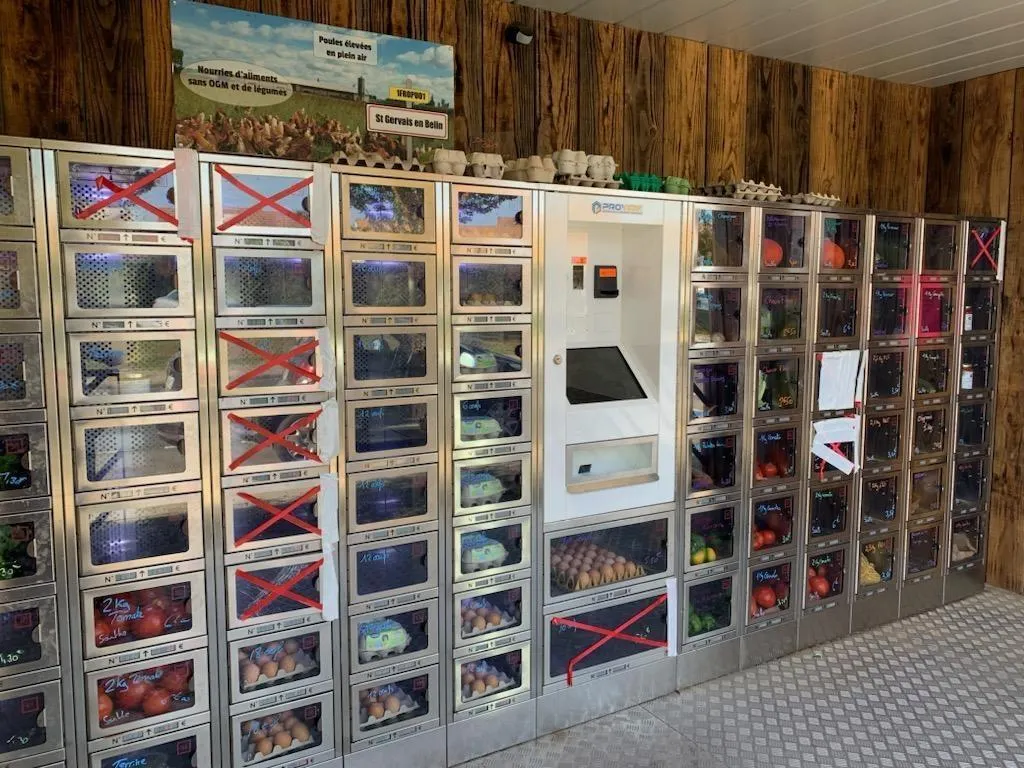 En cet automne 2023, un maraîcher de Saint-Gervais-en-Belin (Sarthe) a installé un distributeur de légumes et d’œufs près de l’ancien restaurant de Saint-Biez-en-Belin. Le paiement s’effectue en espèces ou par carte bancaire.