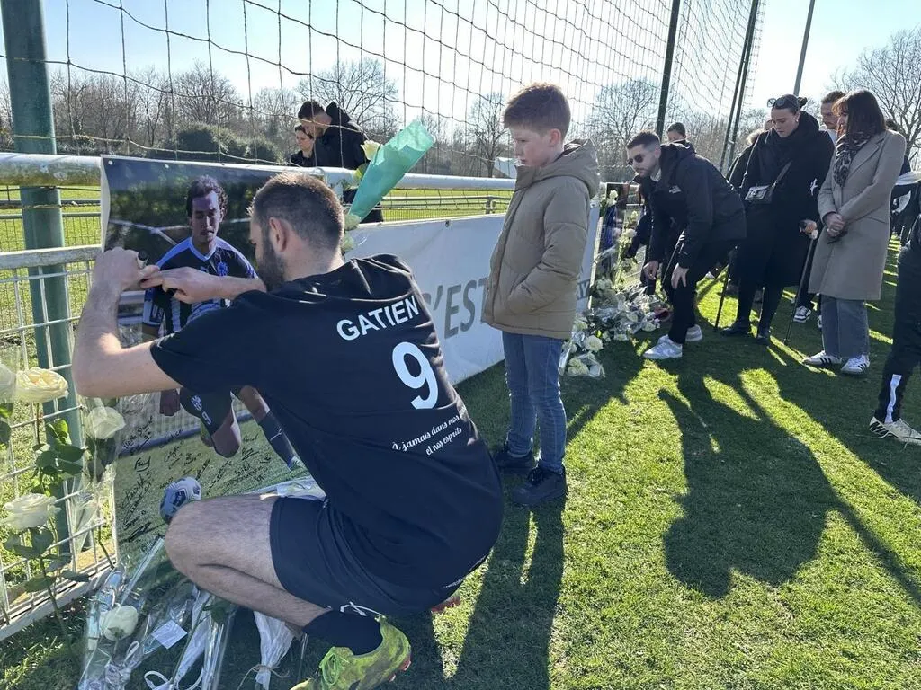 Au stade de Spay dans la Sarthe, un hommage a été rendu, dimanche 2 mars 2025, à Gatien, jeune footballeur de 24 ans tué dans un accident de la route au Mans, le 19 février 2025. © Ouest-France