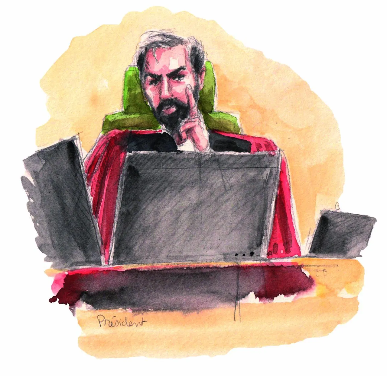 La cour criminelle de la Sarthe, sous la présidence de Stéphane Lorentz (dessin), a reconnu Kévin Fernandez coupable. © Dessin Charlotte Foisseau-Bouttier