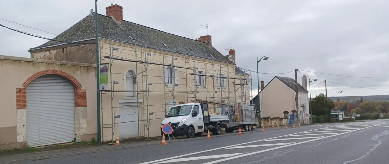 Un homme a chuté de cet échafaudage à Saint-Denis-d’Orques en Sarthe. Il a été héliporté par le Samu vers le centre hospitalier d’Angers dans le Maine-et-Loire. © Guillaume Saligot / Archives Ouest-France