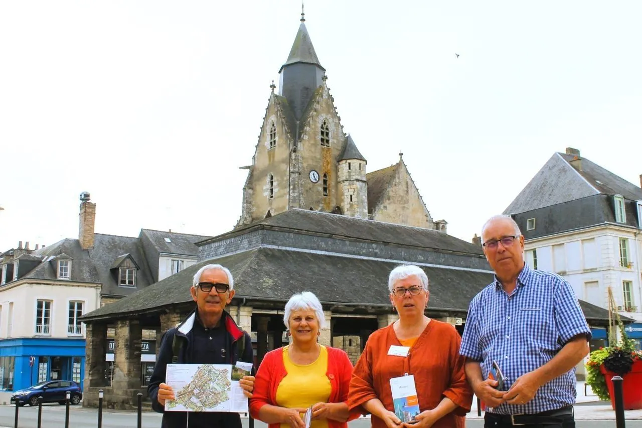 Devant les halles et l’église Saint-Nicolas, lieux emblématiques de Mamers, Gérard Evrard, Brigitte Hérisson, Yvette Sourdille et Bernard Seille présentent le livret. © Le Maine Libre