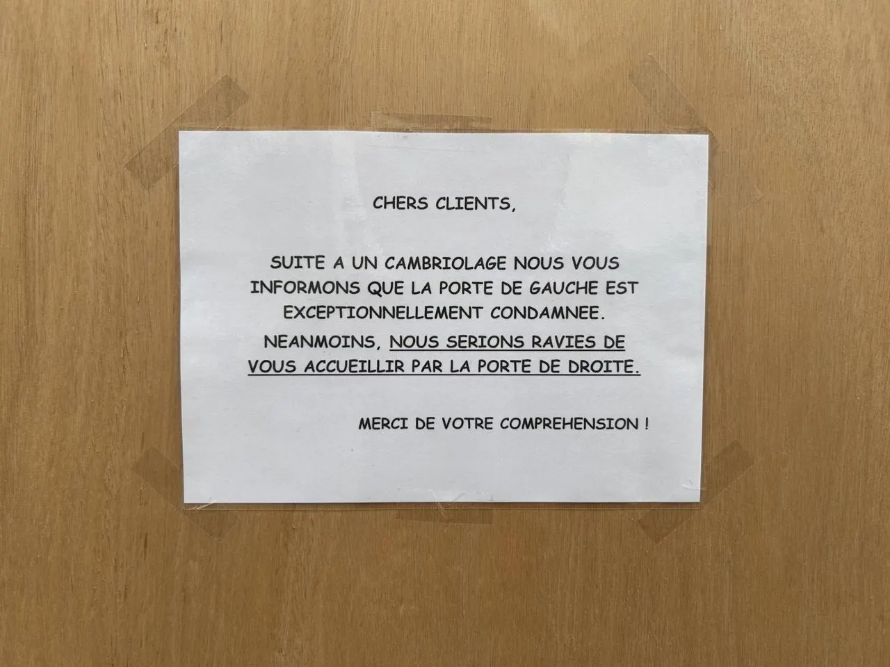 Le Mans, jeudi 11 décembre 2025. Une planche en bois a été posée sur la porte gauche, brisée lors du cambriolage. L’accès à la boutique reste possible par celle de droite. © Le Maine Libre