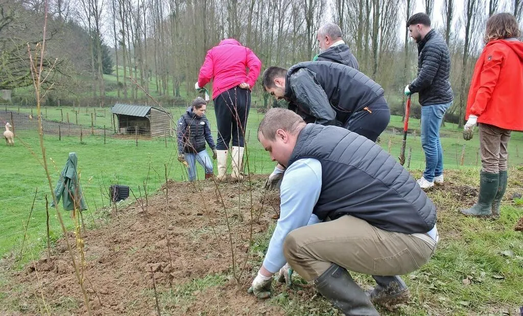 Des salariés de la marque Le Gaulois ont planté des arbres sous la houlette des membres de l’association Bossy-Cévert, près du stade de Solesmes, mardi 19 mars 2024. © Ouest-France