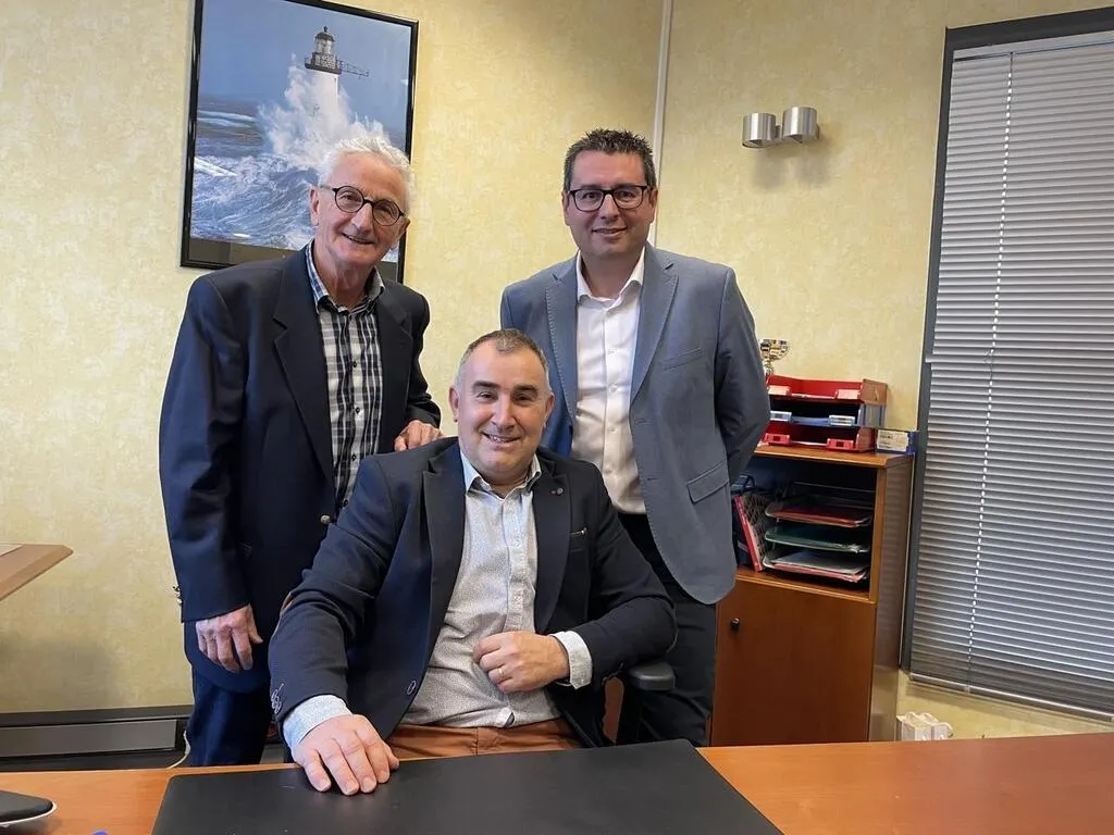Stéphane Baudry, assis, quitte ses fonctions le 16 décembre. Derrière lui, Alain Tessier à gauche, président du conseil d’administration, et le nouveau directeur Sébastien Gillet à droite. © Le Maine Libre