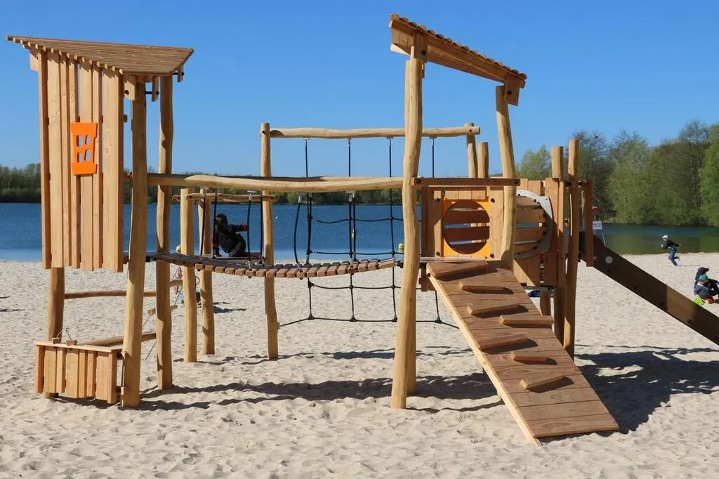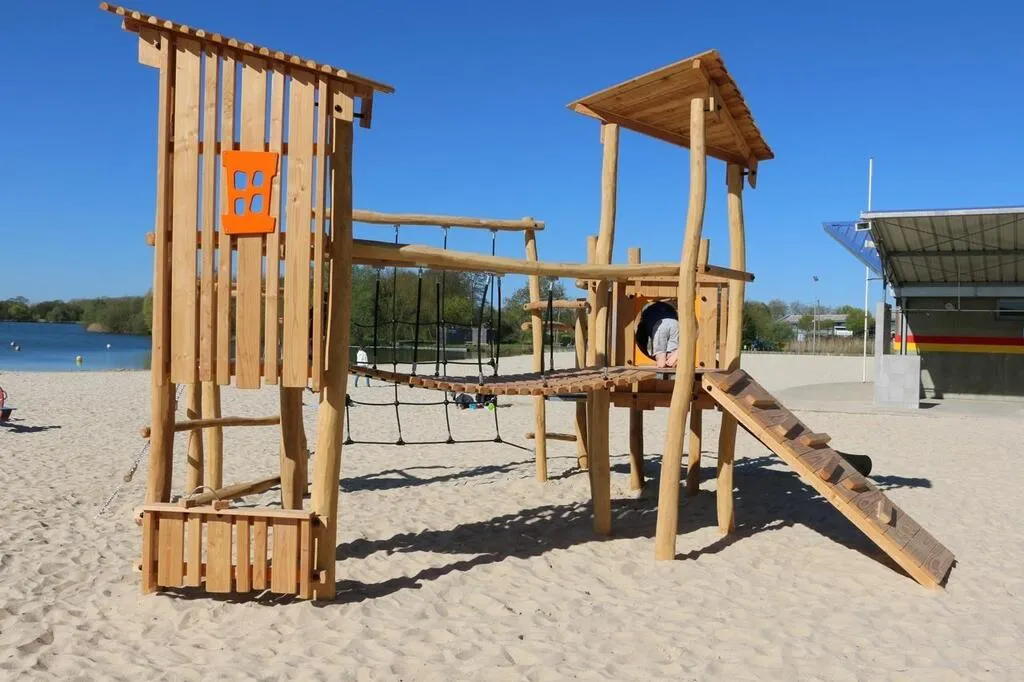 Il est arrivé en même temps que le soleil... Il y a une semaine, un nouveau parc de jeux a été installé sur la plage de la Monnerie, à La Flèche (Sarthe). À destination des 3-11 ans, il permet aux enfants de faire de l’escalade et du toboggan.