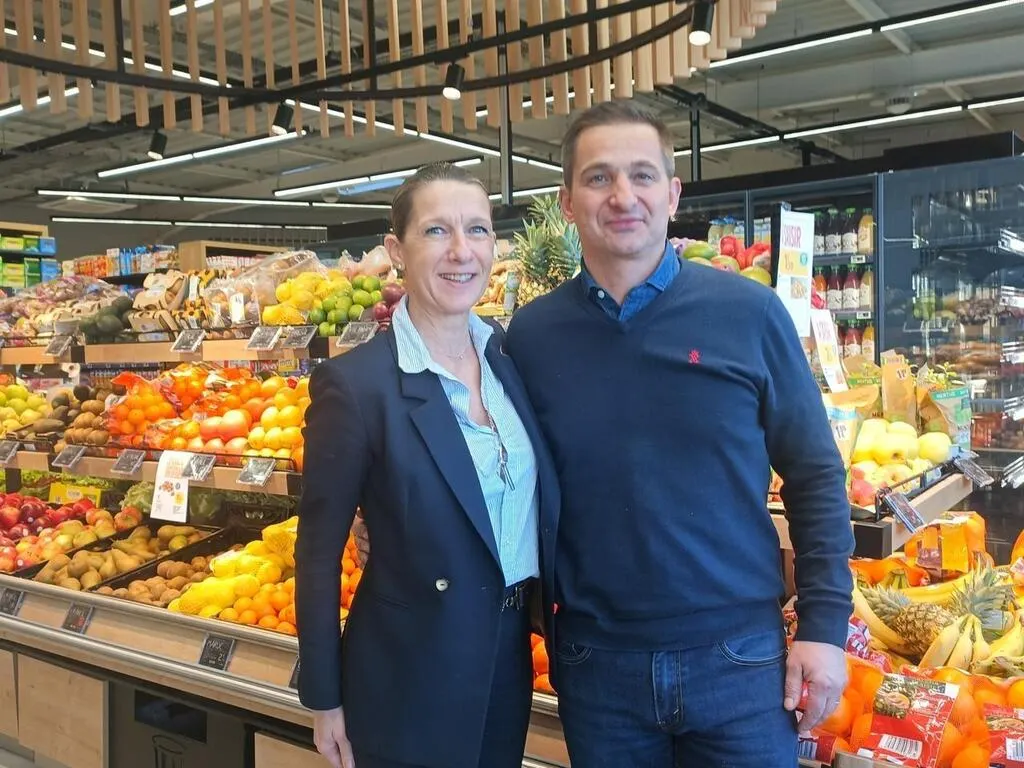 Xavier et Sylvia De Fleurac ont accueilli les premiers clients, ce jeudi 9 janvier 2025, dans l’Intermarché flambant neuf de Coulans-sur-Gée (Sarthe).