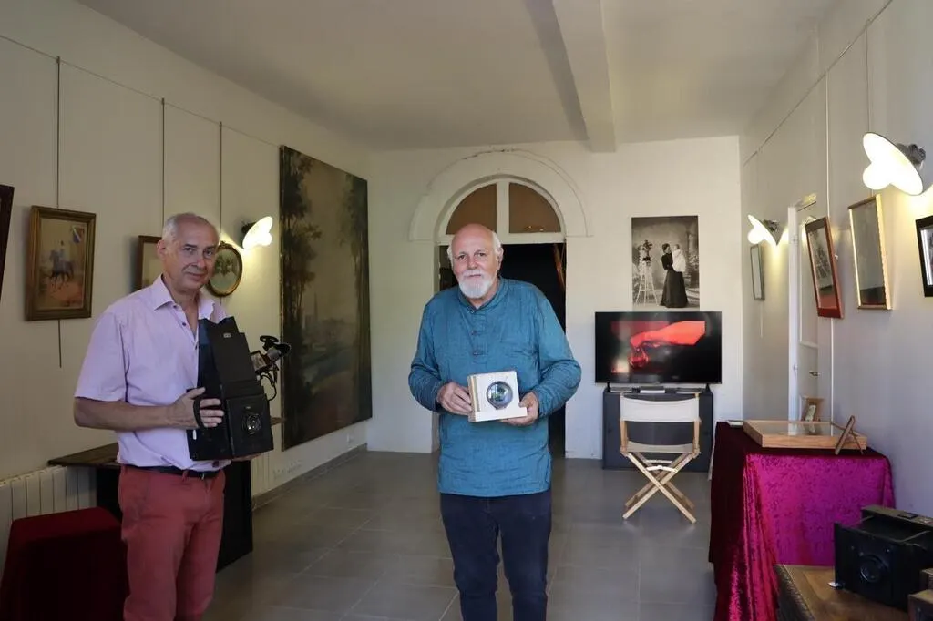 Jean Distel (à gauche) et Patrick Salètes (à droite) ont inauguré, vendredi 4 juillet 2025, une nouvelle salle au sein de l’atelier Malicot dédiée à la pédagogie autour de la photographie. © Ouest-France