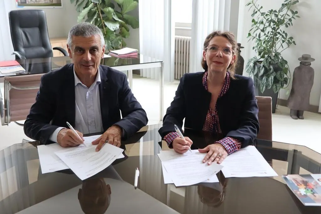 Daniel Chevalier, président de la communauté de communes du Pays sabolien, et Laurence Van Asten, directrice du Conservatoire national des arts et métiers (Cnam) des Pays de la Loire lors de la signature de la convention de partenariat, jeudi 20 juin 2024. © Ouest-France