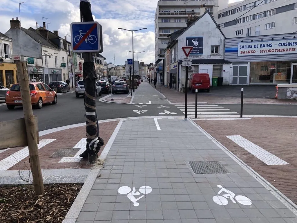 Au Mans, sur cette piste cyclable, les vélos doivent céder le passage pour traverser la chaussée. © Photo Le Maine Libre