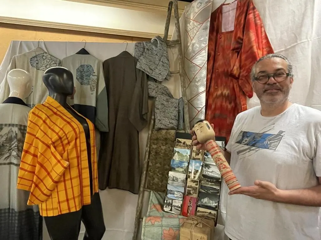 Laurent Yodel Motillon tient une poupée kokeshi de grande taille, en bois. À sa droite, une veste haori rouge et jaune, des kimonos et des ceintures (obi). © Le Maine Libre