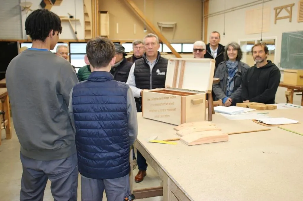 Au cours de la visite des ateliers, Jordan et Jules, élèves en 1re année, ont présenté aux visiteurs, une malle à outillage de leur conception. © Ouest-France