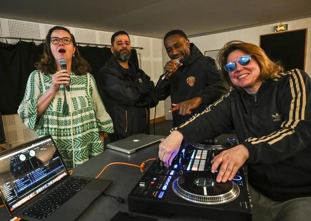 Shanky (à gauche) et Diana Higbee (à droite) associent rap et opéra sous le regard de Big A et DJ L.Atipik au Silo. © Photo : Le Maine Libre – Denis LAMBERT