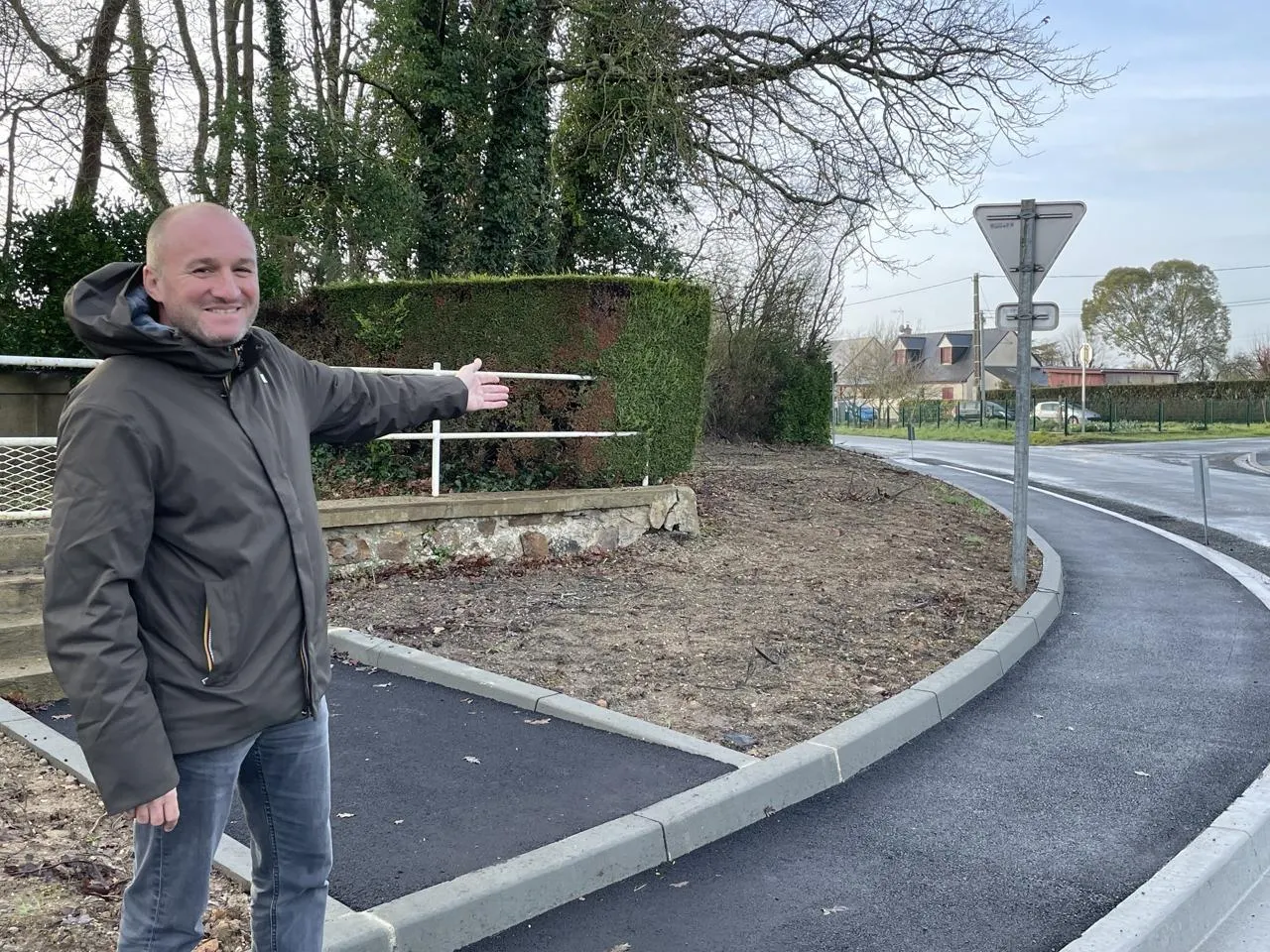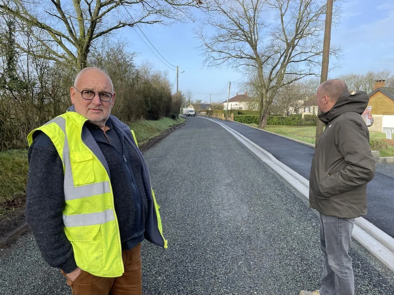 Les adjoints Jean-Pierre Ferrand et Benoît Legay (à droite) rue des Mines : à gauche, le fossé recueillera les eaux de pluie. © Le Maine Libre