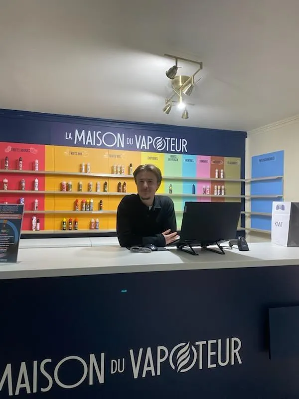 Rémy Levrard derrière le comptoir de sa nouvelle boutique.  © La Maison du Vapoteur – Rémy LEVRARD