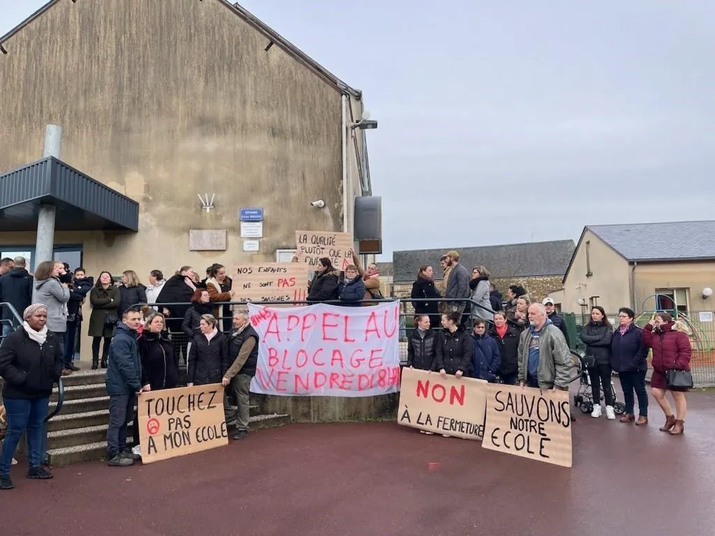 Pour protester contre la fermeture d’une classe à la rentrée de septembre 2024, une soixantaine de personnes ont bloqué l’accès à l’école Georges-Brassens du Lude pendant une heure, ce vendredi 9 février 2024.