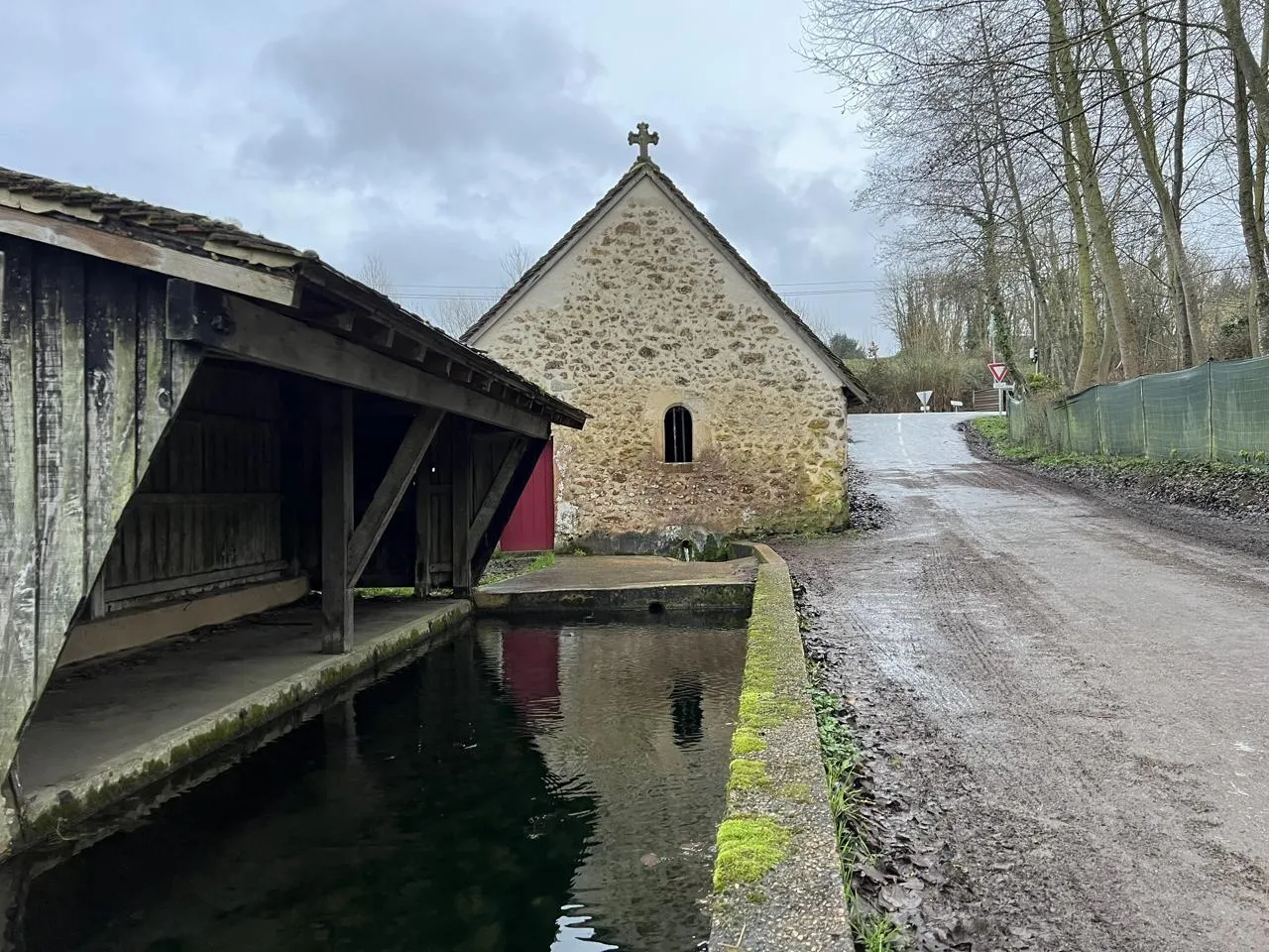 La source de Saint-Quentin, à Saint-Maixent (Sarthe), qui alimente le lavoir est protégée par une petite chapelle. © Yanne Boloh