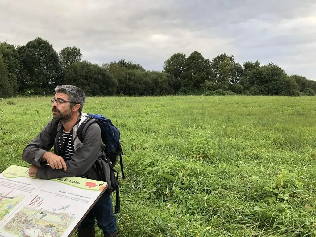 Mathieu Brossard, éducateur à l’environnement au centre permanent d’initiatives pour l’environnement (CPIE) des vallées de la Sarthe et du Loir, a présenté le sentier d’interprétation de la zone humide d’Arthezé, près de La Flèche (Sarthe), aux élus venus l’inaugurer, ce mardi 10 septembre 2024. © Ouest-France
