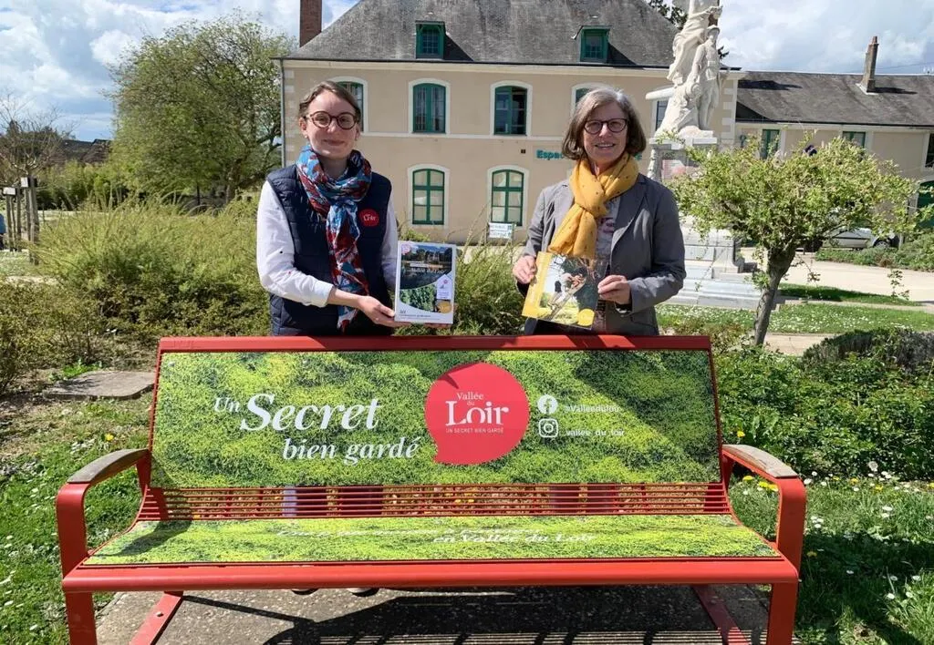 Margaux Seillé, chargée de promotion à l’office de tourisme de la Vallée du Loir, et Monique Trotin, vice-présidente de la communauté de communes Loir Lucé Bercé au tourisme, devant le banc aux couleurs de la Vallée du Loir à Château-du-Loir. © Ouest-France