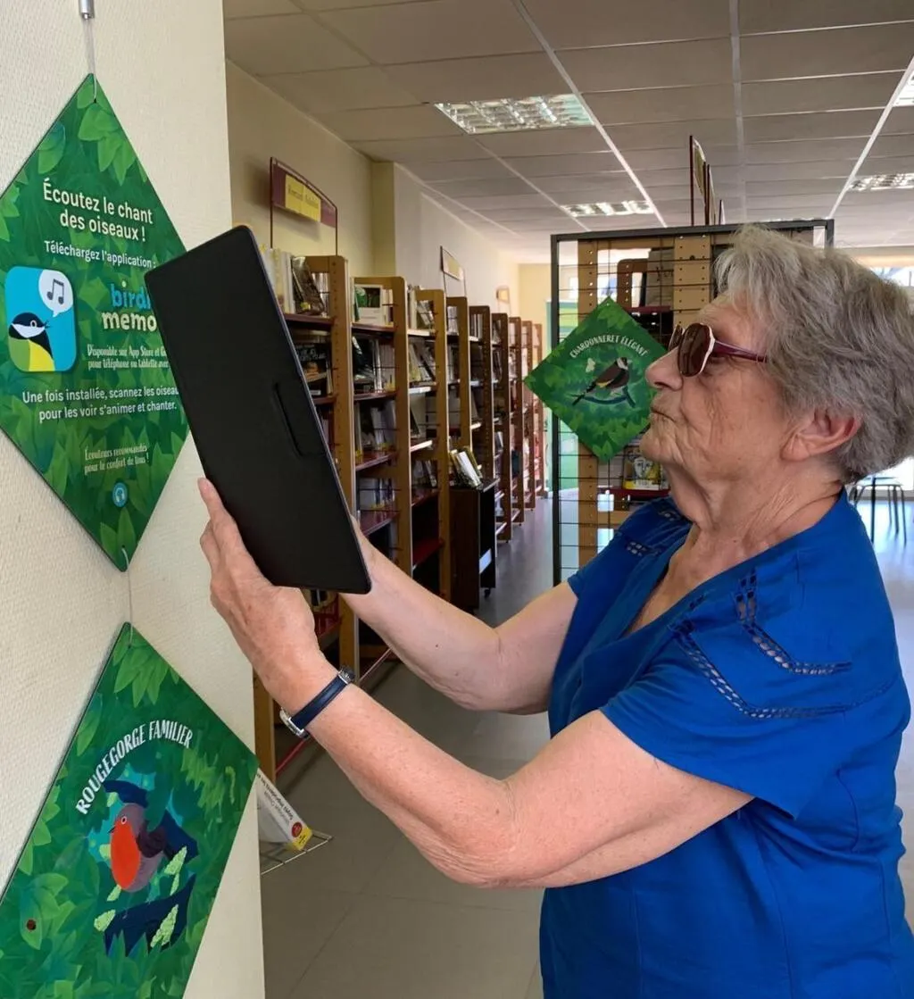 Elle met en valeur les oiseaux de nos régions, tels la grive musicienne, le bruant jaune, la fauvette à tête noire, le roitelet huppé, la mésange charbonnière, ou encore le rouge-gorge familier. « À l’aide d’une tablette, on scanne les images sur les panneaux pour écouter le chant des oiseaux et apprendre une multitude d’informations sur eux », explique Colette Truillard, bénévole de la bibliothèque. On en apprend aussi sur les plumes, la nidification, l’ornithologie, la vie en société…