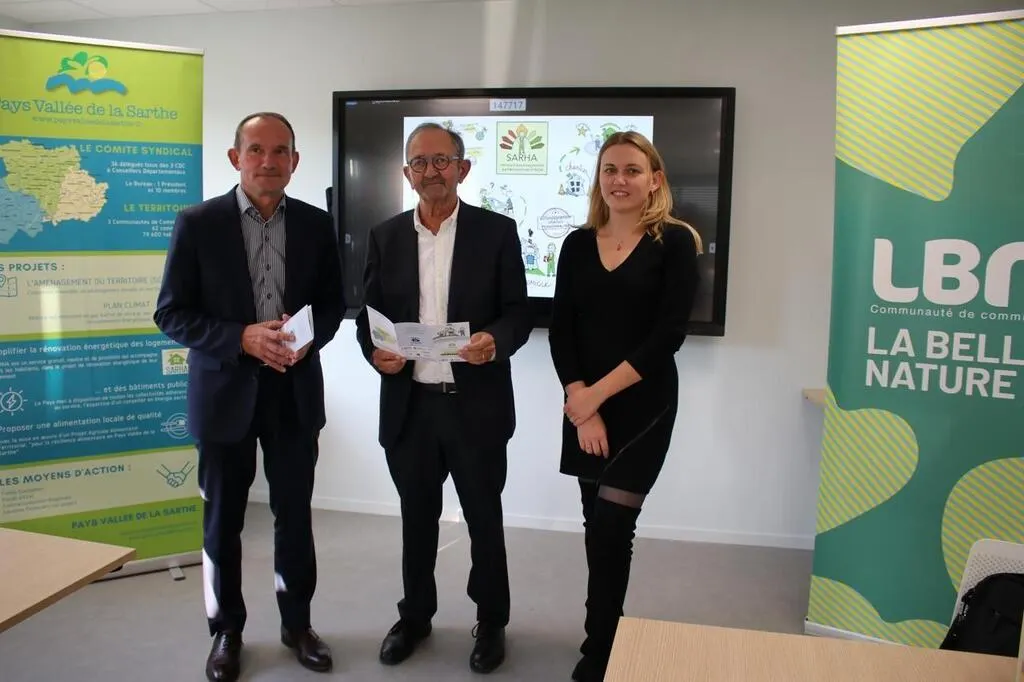 Lancement du dispositif Sarha en présence d’Emmanuel Franco, président du Pays Vallée de la Sarthe, Daniel Coudreuse, président de LBN communauté, et Céline Bihel, directrice de Pays Vallée de la Sarthe. © Le Maine Libre