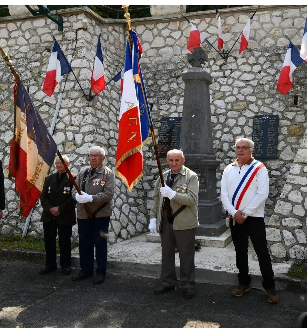 Belle cérémonie du 8 Mai 1945 a Valennes. Recueillement, dépôt de gerbes devant le monument aux morts, discours et deux remises de diplômes et insignes de porte-drapeau par Thierry Victor, maire adjoint, a Jean-Claude Borde et Jean Liquet.