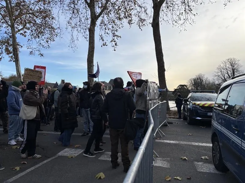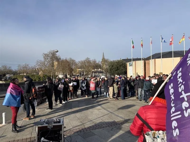 Près de 150 personnes se sont rassemblées ce samedi 22 novembre 2025 en début d’après-midi devant la mairie de La Flèche (Sarthe). Elles entendaient s’associer à la journée de lutte contre les violences faites aux femmes, mais aussi protester contre la présence du président du Rassemblement national venue à La Flèche dédicacer son livre. © Ouest-France