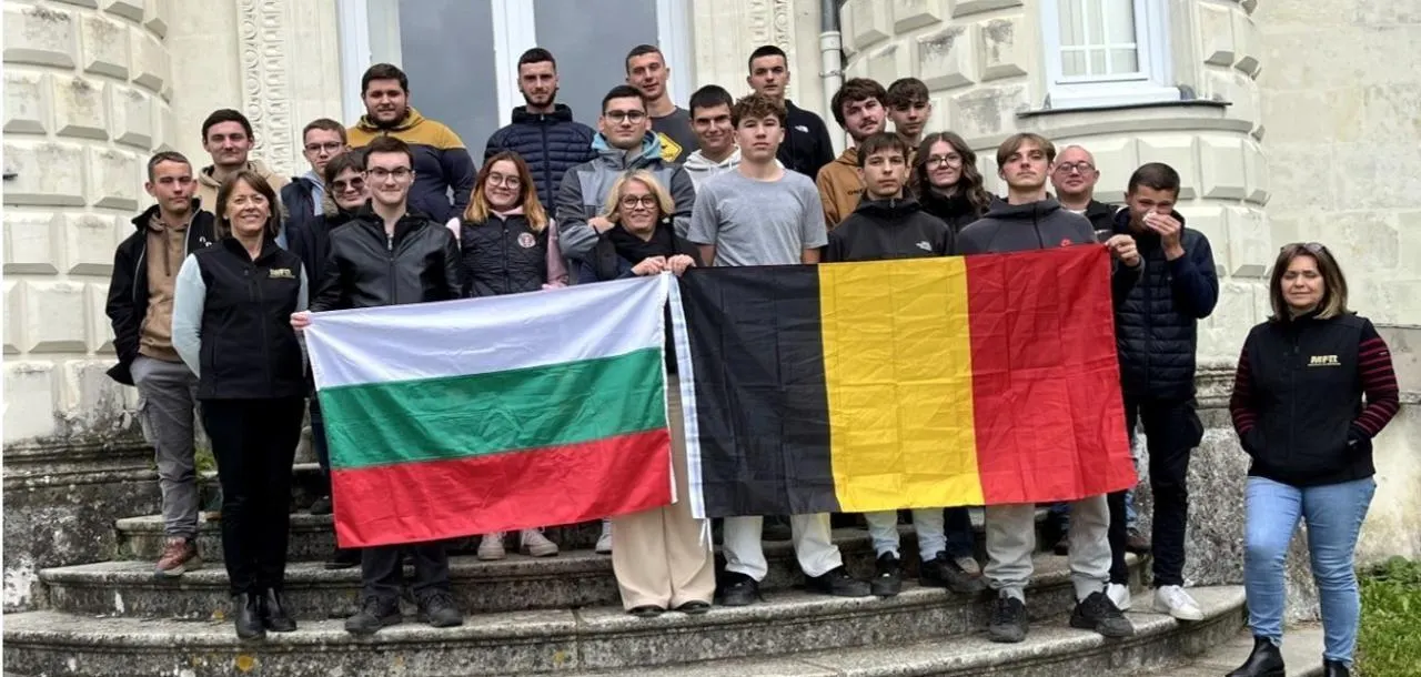 Les élèves de la MFR au moment de leur départ avec les drapeaux bulgare et belge. © MFR