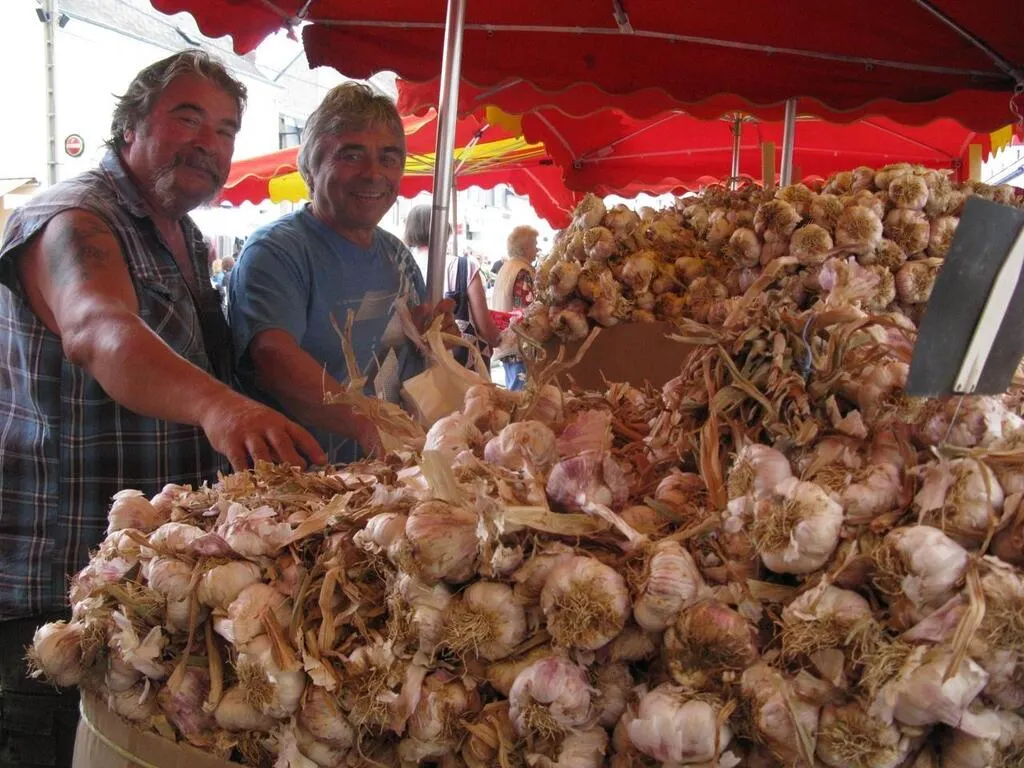 Michel remplit son cabas d’oignons, d’ail et d’échalotes. Je viens depuis trente ans à la foire aux oignons. C’est bizarre mais les oignons de Roscoff sont moins chers ici que dans le Finistère ! Je prends aussi de l’ail parce que c’est bon pour le cœur ...