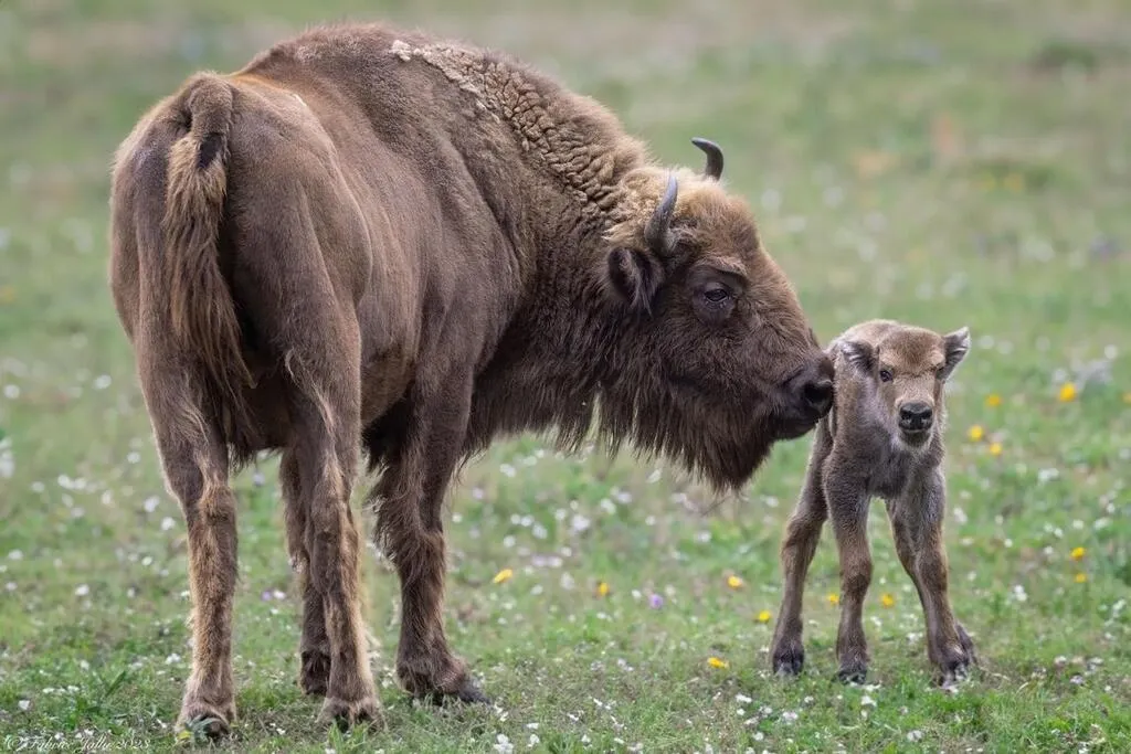 Pêche, bison d’Europe – ici avec sa petite – a quitté le zoo de Pescheray pour l’Allemagne dans le cadre d’un programme européen (EEP). Elle fera peut-être partie des animaux à rejoindre l’Azerbaïdjan, dans plusieurs semaines. © Fabrice Jallu – Domaine de Pescheray