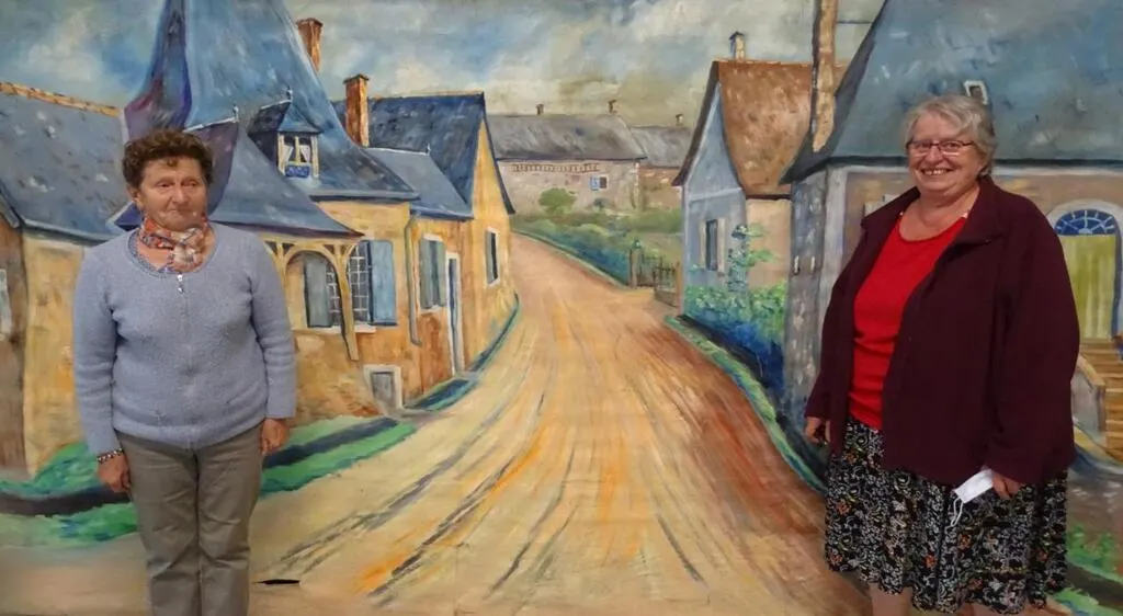 Paulette Lenoir, de Générations mouvement et Nicole Leroux posent devant une fresque de Gaston Pichot. Ici, le bas de la rue de Saint-Georges (exposée à la halle). © Le Maine Libre
