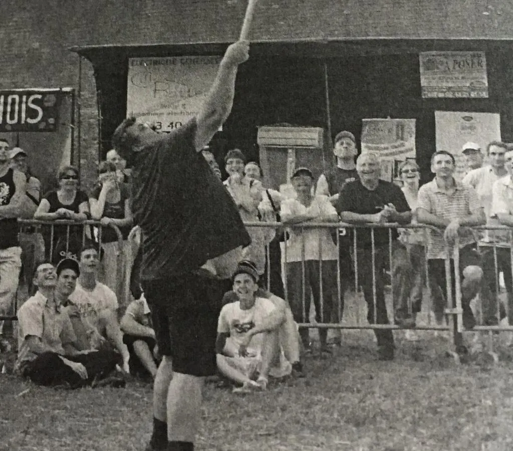 Le comice est souvent l’occasion de jeux et joutes comme ici « Nono » lors d’une levée de ballot de paille lors du comice 2004. © Archives Le Maine Libre