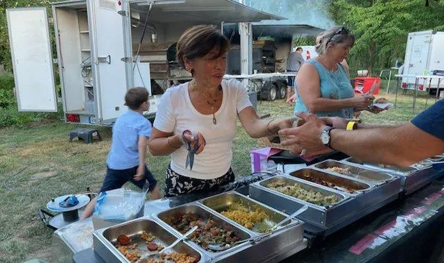 Le cadre de l’Aire du Pont Roman est adapté en ce jour de forte chaleur, l’aire est entourée par le ruisseau de la Veuve où l’on entend le clapotis de l’eau et d’immenses peupliers apportent un air de fraîcheur, apprécié les convives installés sur les tables mises à disposition. L’estaminet éphémère est très sollicité pour se désaltérer avec modération.