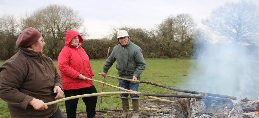 « Au fil de cet hiver, j’ai accumulé des tailles de bois, résidus de haies dans un lieu isolé, afin de réaliser un brasier et pratiquer le bois brûlé, comme le faisaient les agriculteurs autrefois en période hivernale », explique l’agricultrice. Son père poursuit : Alors que les travaux de la terre étaient au point mort en période hivernale, nous allions sélectionner, dans les haies, les bois, des branches de noisetier, houx ou frêne, à la sève descendante, pour la confection de manches. Au préalable il était nécessaire de les brûler en les plongeant dans un brasier, pour écarter la prolifération de vers entre l’écorce et le bois pour une meilleure conservation