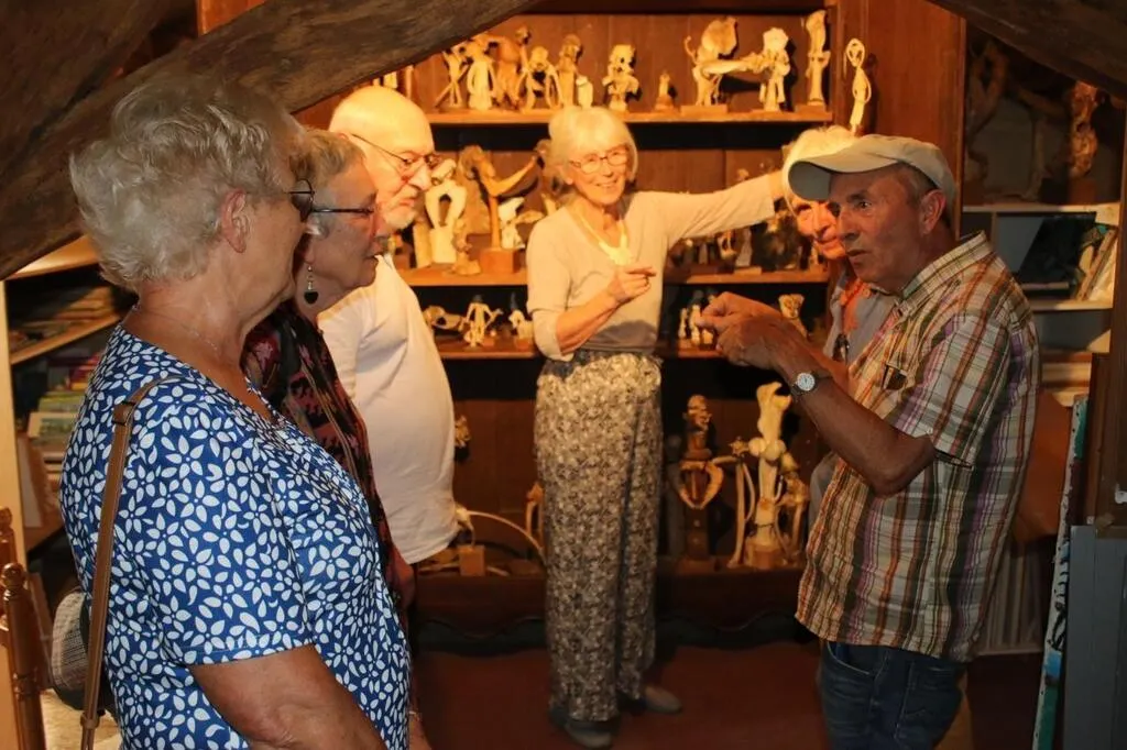 Monique Audureau, membre de l’association, présente aux visiteurs, dont Toni, à droite, des œuvres de Gaston Floquet, réalisées à partir d’ossements d’animaux retrouvés dans la nature par l’artiste. © Le Maine Libre
