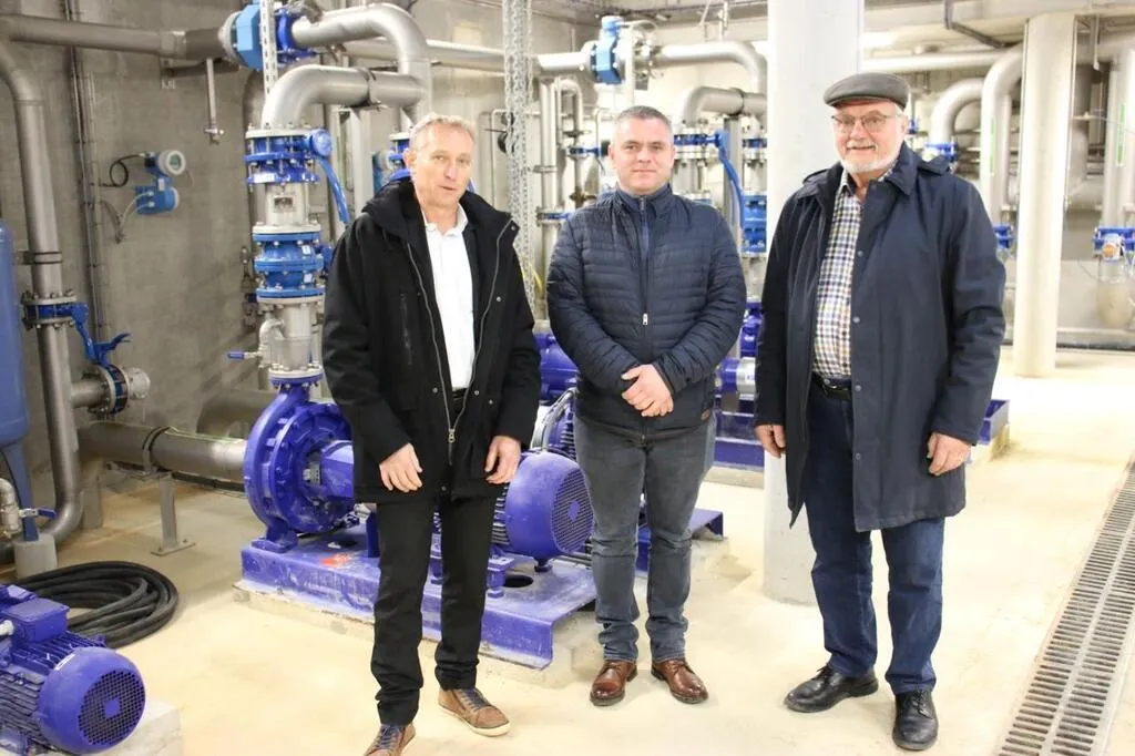 Joseph Lambert, président du Syndicat intercommunal de production d’eau potable (à droite), accompagné de Guillaume Douheret et Jean-Pierre Pacilly, de STGS, à l’intérieur de l’usine de décarbonatation. © Le Maine Libre