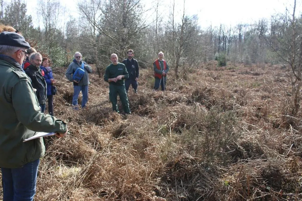 En avril, lors d’une randonnée à la découverte de la biodiversité, Jérôme Dodier, technicien territorial ONF, au centre, présente une zone de végétation sèche (fougères ), fortement exposée à un risque d’incendie. © archives Le Maine Libre
