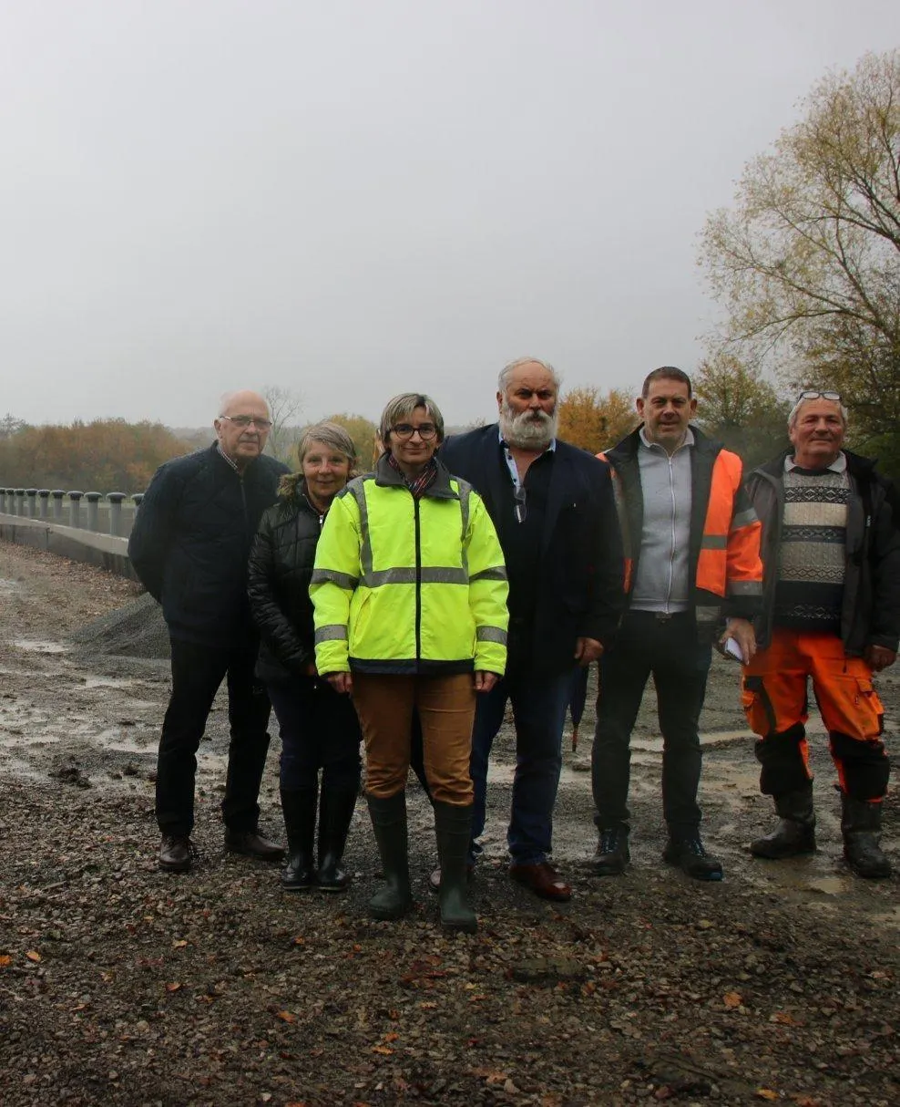 Devant les bassins, Amélie Baudeloche (veste réfléchissante), accompagnée à sa gauche d’André Trottet, des élus (à gauche), les représentants de l’entreprise ERSE missionnée pour les travaux. © Ouest-France