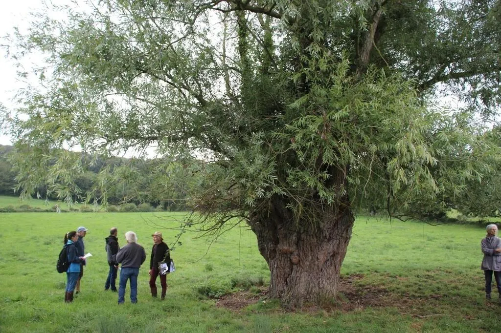 Mariette Petitjean a accompagné les membres du jury dans la visite de parcelles, au pied d’une souche de saule centenaire de la Gaec de Perseigne de Cyril et Damien Adam à La Fresnaye. © Le Maine Libre