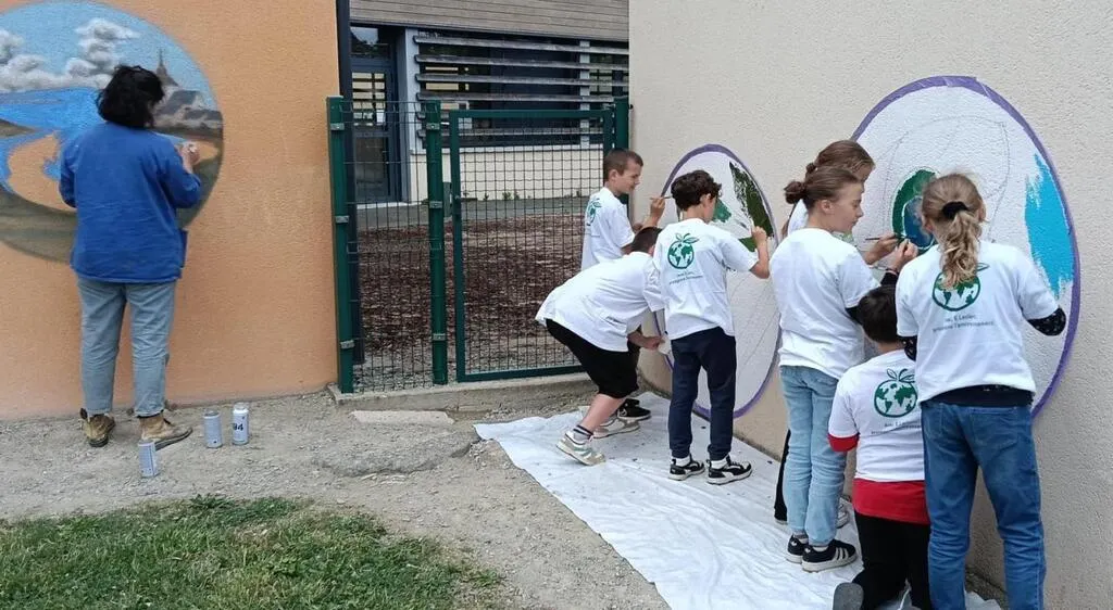 Des élèves ont aidé les artistes à réaliser les fresques. © Le Maine Libre