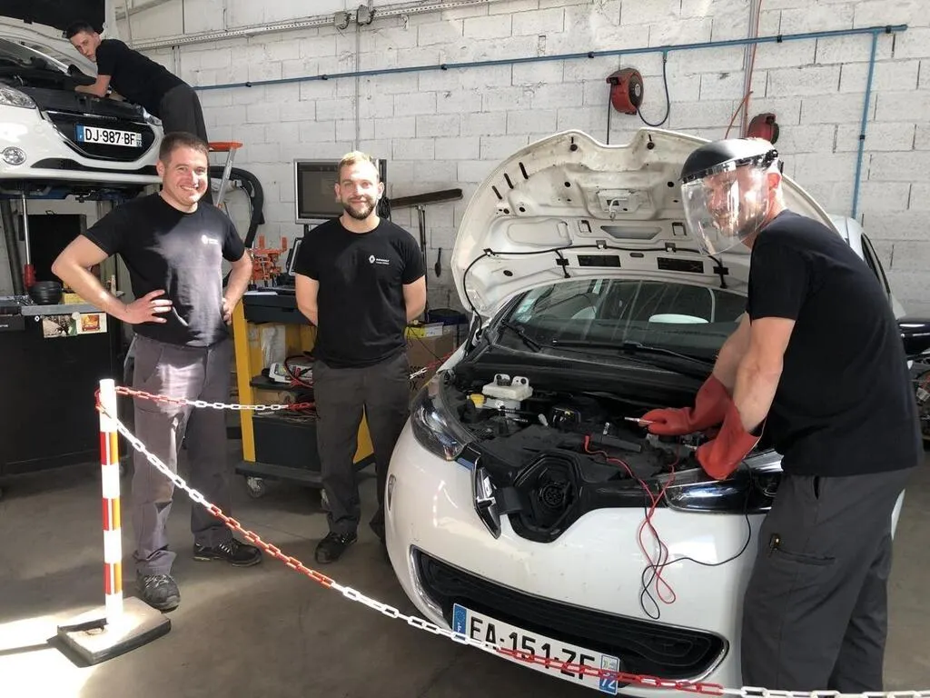 Guillaume Leroux (tout à gauche), responsable du garage Renault à Saint-Gervais-en-Belin, et deux de ses employés, se sont formés pour devenir techniciens experts en réparation de voitures électriques. © Le Maine Libre