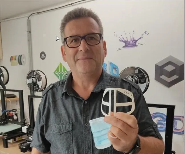Augusto Victor tient un écarteur de masque. Le fruit de la vente de cet équipement servira à financer les formations à l’impression 3D. © Le Maine Libre