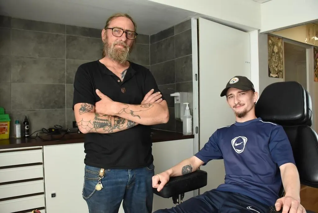 Will (debout) vient d’ouvrir son salon Will Tat2, dans le passage Saint-Martin, en plein centre-ville de Sablé. À ses côtés, Ty est en apprentissage. © Le Maine Libre
