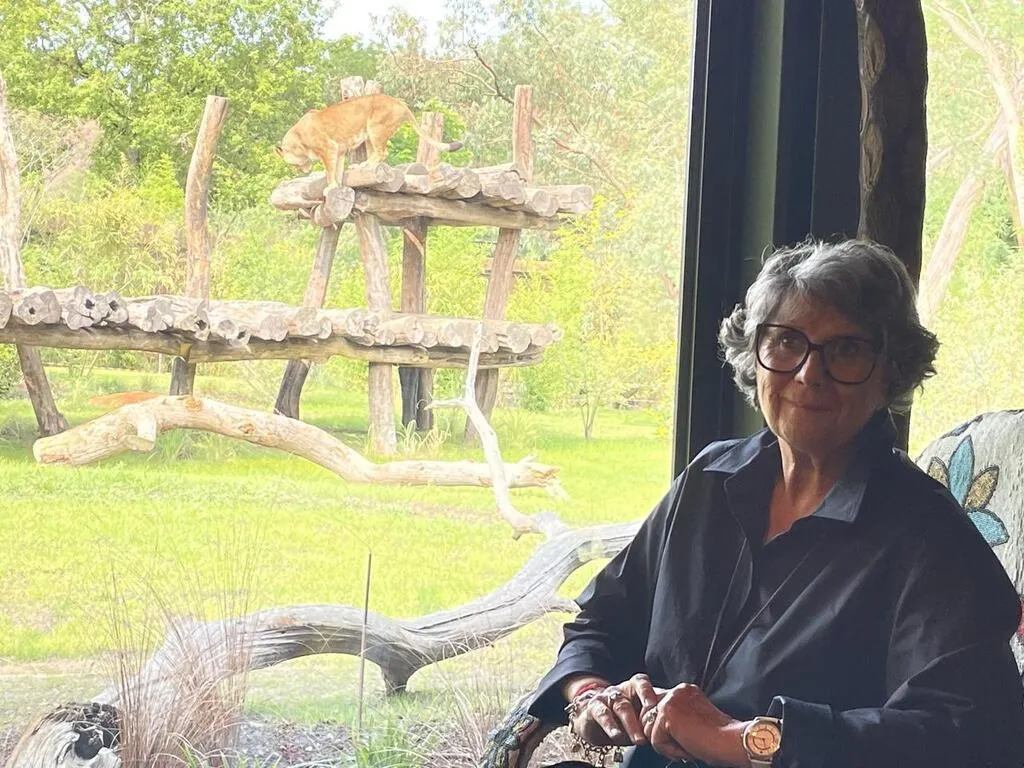 Claudine Pellerin avant son départ du zoo de La Flèche le lundi 10 juillet 2023, dans le grand salon du nouveau Safari suite. En arrière-plan, prête à bondir, la lionne Malindi. © Le Maine Libre