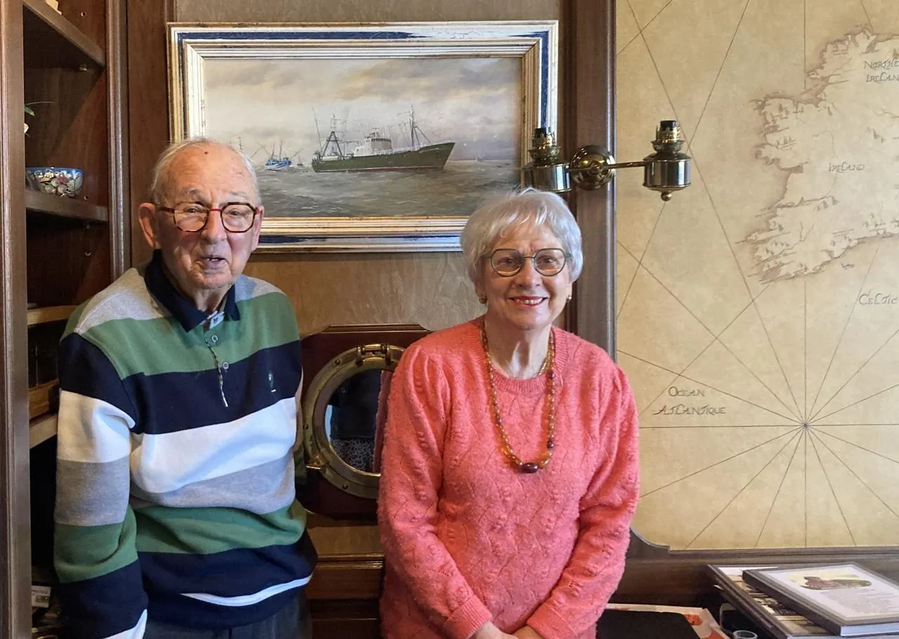 Jean et Annie Tonnerre devant le tableau d’un bateau commandé par Jean. © Ouest-France