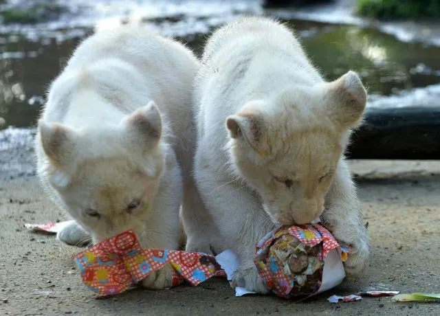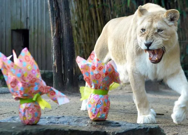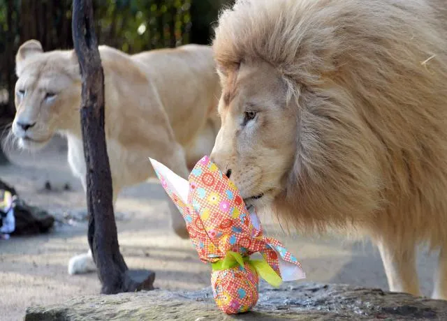 Mais nouveauté cette année, les animaux étaient, eux aussi, invités à se délecter de l'esprit de Pâques. Ours polaires, singes, lions et autres tigres n'ont pas boudé leur plaisir. Ils se sont rués sur ces œufs, non pas en chocolat, mais confectionné avec leur nourriture habituelle.
