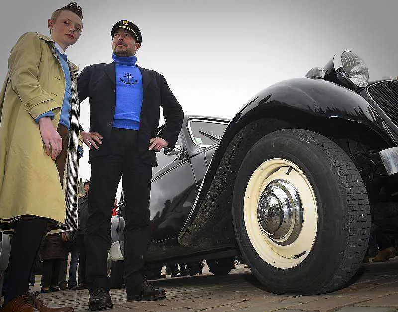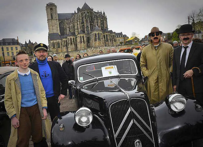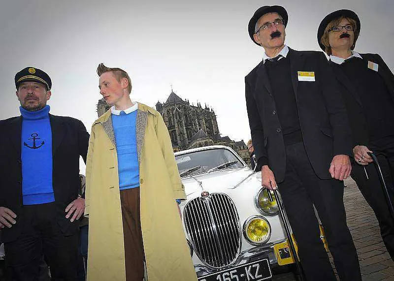 Au pied de la cathédrale, garées côte à côte, toutes ces voitures avaient un dénominateur commun : être l’une de celles que l’on retrouve dans les différents albums de Tintin, comme la Jaguar MK2 (de 1967) de « Coke en stock », la Citroën Traction (1954) de « L’oreille cassée », ou la Peugeot 203 (1951) de « L’affaire Tournesol. »