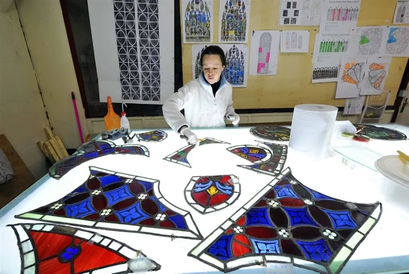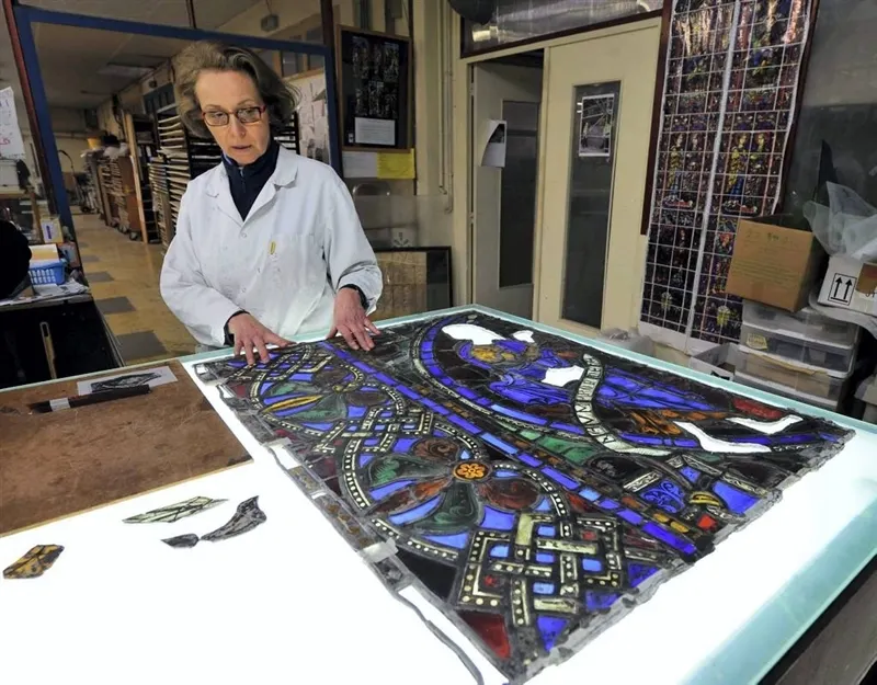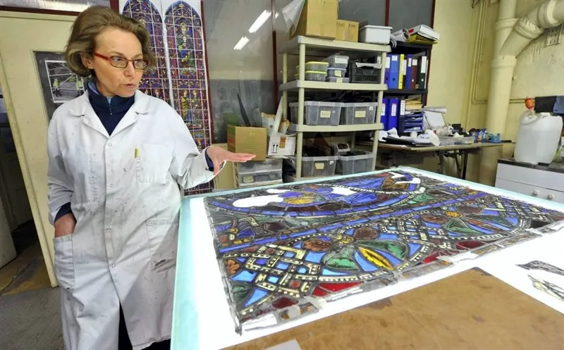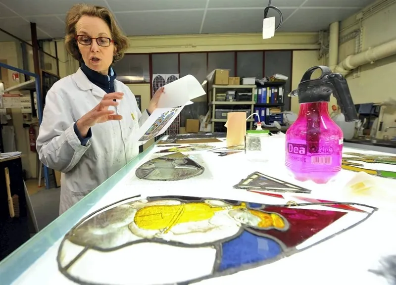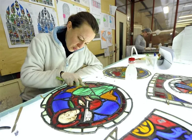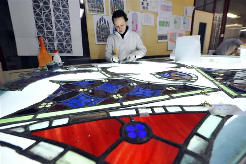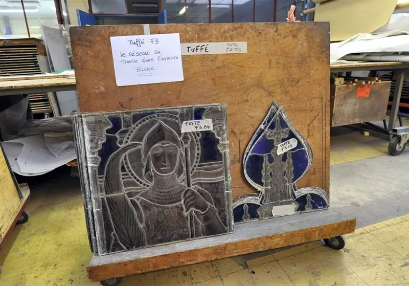 Au Mans, les ateliers de Vitrail France, que dirige Béatrice Alliou, s’attaquent à 600 panneaux de la cathédrale de Tours du XIVe siècle, trois baies monumentales du XIIIe siècle de la façade occidentale de la cathédrale de Chartres, des éléments de la cathédrale d’Alençon (une baie du XVIe siècle) et une petite verrière du XIXe siècle de l’église de Tuffé toutefois couronnée d’un petit réseau du XVIe siècle décoré d’anges musiciens.