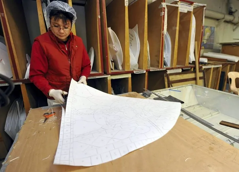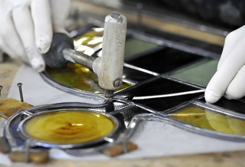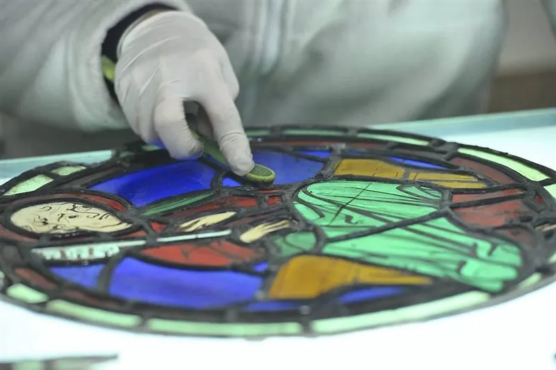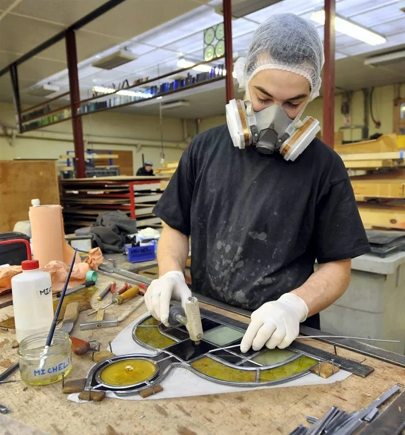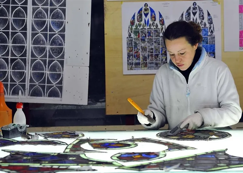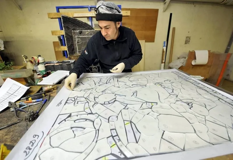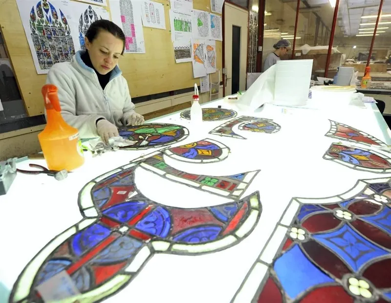 Au Mans, les ateliers de Vitrail France, que dirige Béatrice Alliou, s’attaquent à 600 panneaux de la cathédrale de Tours du XIVe siècle, trois baies monumentales du XIIIe siècle de la façade occidentale de la cathédrale de Chartres, des éléments de la cathédrale d’Alençon (une baie du XVIe siècle) et une petite verrière du XIXe siècle de l’église de Tuffé toutefois couronnée d’un petit réseau du XVIe siècle décoré d’anges musiciens.